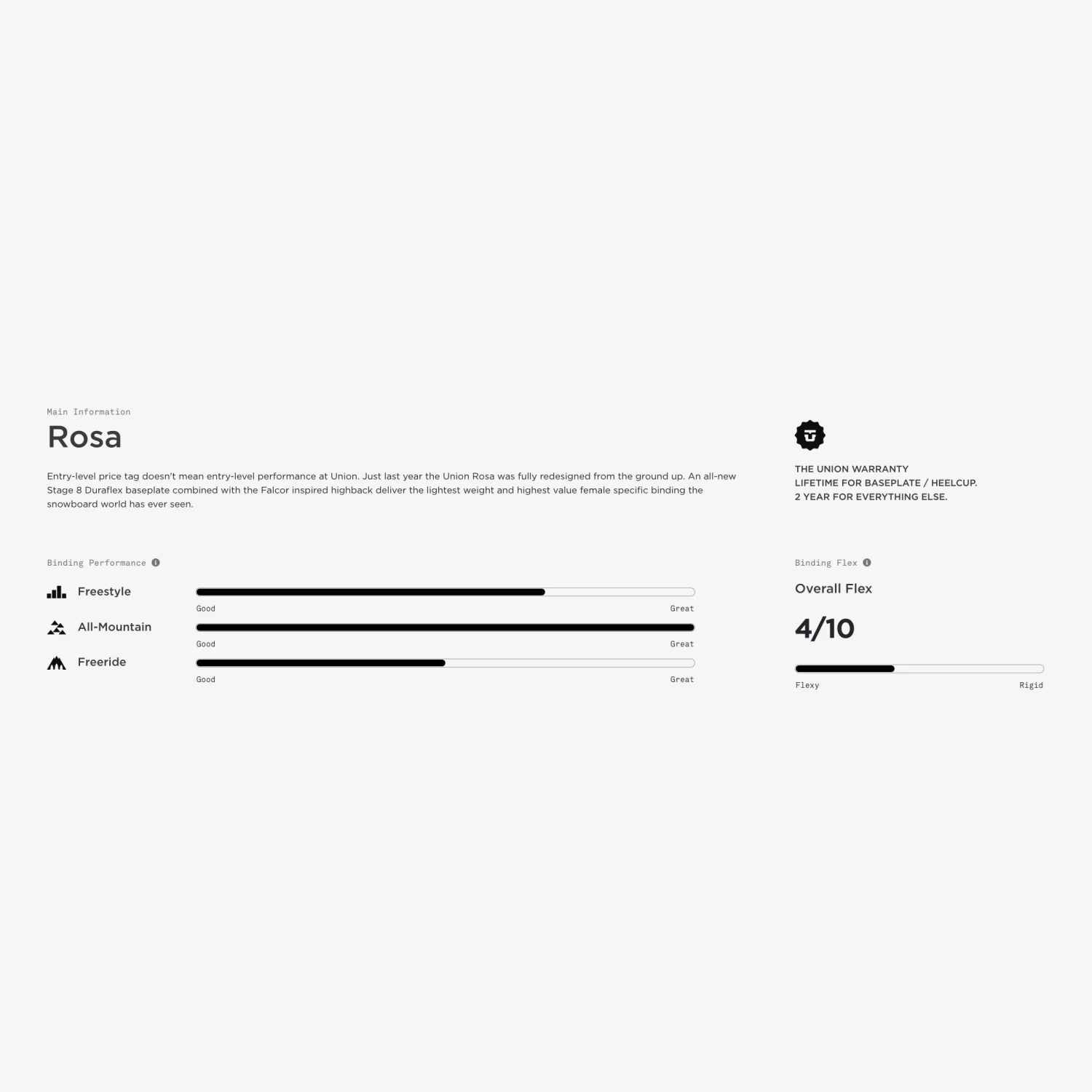 Une fix UNION™ abordable mais haut de gamme, destinée aux Femmes. Un design léger et efficace, une baseplate Stage 8 Duraflex combinée avec spoiler highback confortable. Le résultat? pour une fixation extremement légère, passe-partout, confortable et parfaitement étudiée pour les Femmes. Flex: 4/10